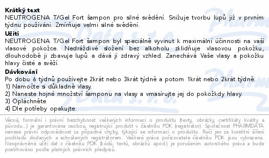 NEUTROGENA T/Gel Fort šampon pro silné svědění. Snižuje tvorbu lupů již v prvním týdnu používání. Zmírňuje velmi silné svědění.