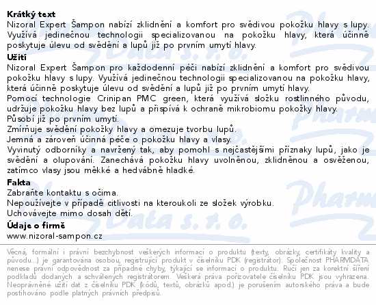 Nizoral Expert Šampon nabízí zklidnění a komfort pro svědivou pokožku hlavy s lupy. Využívá jedinečnou technologii specializovanou na pokožku hlavy, která účinně poskytuje úlevu od svědění a lupů již po prvním umytí hlavy.