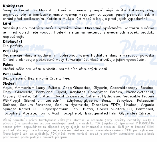 Šampon Growth & Nourish , který kombinuje ty nejúčinnější složky Kokosový olej, arganový olej a bambucké máslo vyživují vlasy zevnitř, zvyšují jejich pevnost, lesk a chrání před poškozením. Kofein stimuluje růst vlasů a bojuje proti jejich vypadávání.