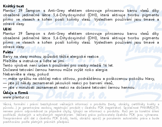 Plantur 39 Šampon s Anti-Grey efektem obnovuje přirozenou barvu vlasů díky obsažené jedinečné látce 5,6-Dihydoxyindol (DHI), která aktivuje tvorbu pigmentu přímo ve vlasech a kofein posílí kořínky vlasů. Výsledkem používání jsou tmavé a zdravé vlasy.