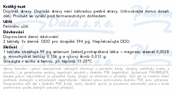Produkt se vyrábí pod farmaceutickým dohledem. Složení: 1 tableta obsahuje 99 pg Selenium (selen), protispékavá látka - magnesii stearat 0,0028 g, monohydrát laktózy 0,136 g a rýžový škrob 0,012 g – součást tablety.