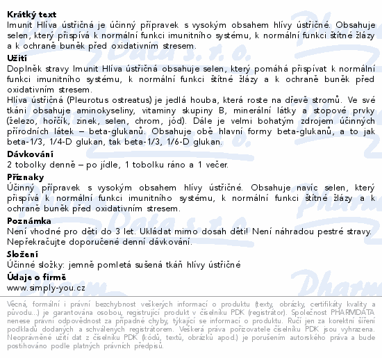 Imunit Hlíva ústřičná je účinný přípravek s vysokým obsahem hlívy ústřičné. Obsahuje selen, který přispívá k normální funkci imunitního systému, k normální funkci štítné žlázy a k ochraně buněk před oxidativním stresem.