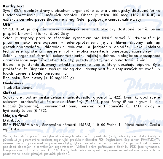 Syrel IBSA, doplněk stravy s obsahem organického selenu v biologicky dostupné formě L-selenomethionin, 30 měkkých tobolek. Obsahuje selen 100 mcg (182 % RHP) a extrakt z černého pepře Bioperine 5 mg. Selen podporuje činnost štítné žlázy.