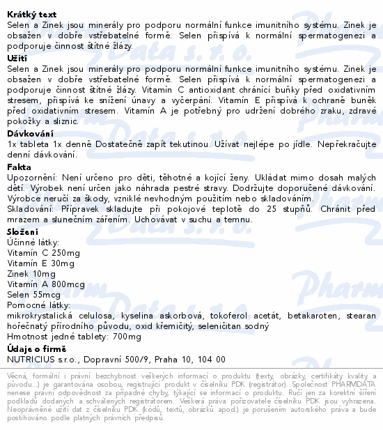 Selen a Zinek jsou minerály pro podporu normální funkce imunitního systému. Zinek je obsažen v dobře vstřebatelné formě. Selen přispívá k normální spermatogenezi a podporuje činnost štítné žlázy.
