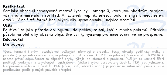 Semínka obsahují nenasycené mastné kyseliny – omega 3, které jsou vhodným zdrojem vitamínů a minerálů, například: A, E, zinek, vápník, železo, fosfor, mangan, měď, selen, draslík. V nejčistší formě bez jakýchkoliv úprav obsahují nejvíce vitamínů.