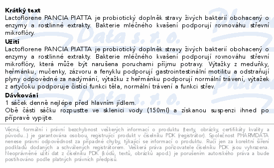 Lactoflorene PANCIA PIATTA je probiotický doplněk stravy živých bakterií obohacený o enzymy a rostlinné extrakty. Bakterie mléčného kvašení podporují rovnováhu střevní mikroflóry.