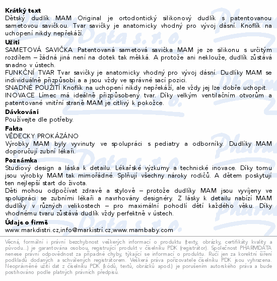Dětský dudlík MAM Original je ortodontický silikonový dudlík s patentovanou sametovou savičkou. Tvar savičky je anatomicky vhodný pro vývoj dásní. Knoflík na uchopení nikdy nepřekáží.