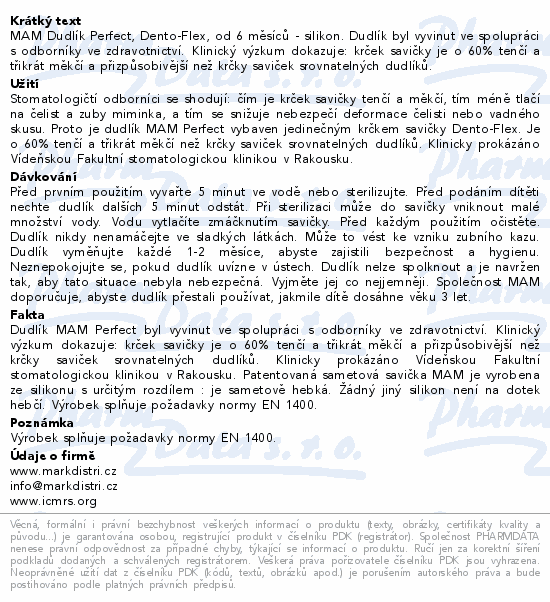 MAM Dudlík Perfect, Dento-Flex, od 6 měsíců - silikon. Dudlík byl vyvinut ve spolupráci s odborníky ve zdravotnictví. Klinický výzkum dokazuje: krček savičky je o 60% tenčí a třikrát měkčí a přizpůsobivější než krčky saviček srovnatelných dudlíků.