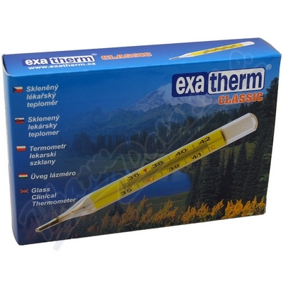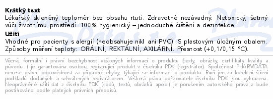 Lékařský skleněný teploměr bez obsahu rtuti. Zdravotně nezávadný. Netoxický, šetrný vůči životnímu prostředí. 100% hygienický – jednoduché čištění a dezinfekce.