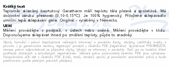 Teploměr skleněný bezrtuťový Geratherm měří teplotu těla přesně a spolehlivě. Má doživotní záruku přesnosti (0,10-0,15°C). Je 100% hygienický. Přiložené sklepávadlo umožní lepší sklepávání galia. Originál - vyráběný v Německu.