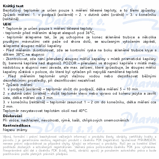 Bezrtuťový teploměr je určen pouze k měření tělesné teploty, a to třemi způsoby. Způsob měření: 1. v podpaží (axilárně) – 2. v dutině ústní (orálně) – 3. v konečníku (rektálně).