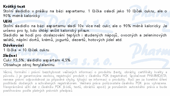 Stolní sladidlo v prášku na bázi aspartamu. 1 lžička osladí jako 10 lžiček cukru, ale o 90% méně kaloricky.