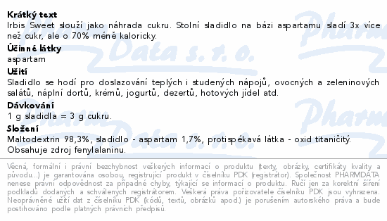 Irbis Sweet slouží jako náhrada cukru. Stolní sladidlo na bázi aspartamu sladí 3x více než cukr, ale o 70% méně kaloricky.