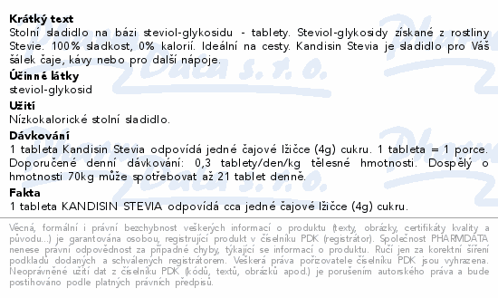 Stolní sladidlo na bázi steviol-glykosidu - tablety. Steviol-glykosidy získané z rostliny Stevie. 100% sladkost, 0% kalorií. Ideální na cesty. Kandisin Stevia je sladidlo pro Váš šálek čaje, kávy nebo pro další nápoje.