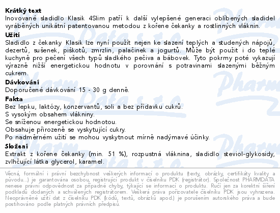 Inovované sladidlo Klasik 4Slim patří k další vylepšené generaci oblíbených sladidel vyráběných unikátní patentovanou metodou z kořene čekanky a rostlinných vláknin.