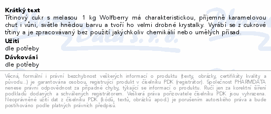 Třtinový cukr s melasou 1 kg Wolfberry má charakteristickou, příjemně karamelovou chuť i vůni, světle hnědou barvu a tvoří ho velmi drobné krystalky. Vyrábí se z cukrové třtiny a je zpracovávaný bez použití jakýchkoliv chemikálií nebo umělých přísad.