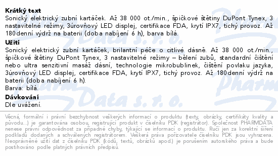 Sonický elektrický zubní kartáček. Až 38 000 ot./min., špičkové štětiny DuPont Tynex, 3 nastavitelné režimy, 3úrovňový LED displej, certifikace FDA, krytí IPX7, tichý provoz. Až 180denní výdrž na baterii (doba nabíjení 6 h), barva bílá.