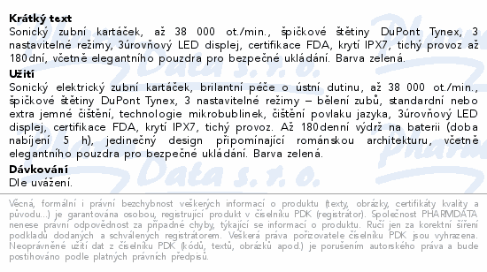 Sonický zubní kartáček, až 38 000 ot./min., špičkové štětiny DuPont Tynex, 3 nastavitelné režimy, 3úrovňový LED displej, certifikace FDA, krytí IPX7, tichý provoz až 180dní, včetně elegantního pouzdra pro bezpečné ukládání. Barva zelená.
