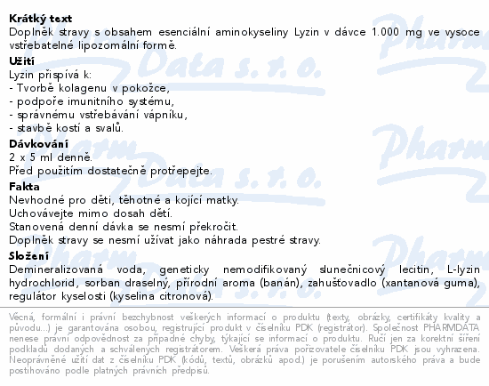 Doplněk stravy s obsahem esenciální aminokyseliny Lyzin v dávce 1.000 mg ve vysoce vstřebatelné lipozomální formě.