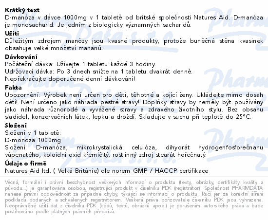 D-manóza v dávce 1000mg v 1 tabletě od britské společnosti Natures Aid. D-manóza je monosacharid. Je jedním z biologicky významných sacharidů.