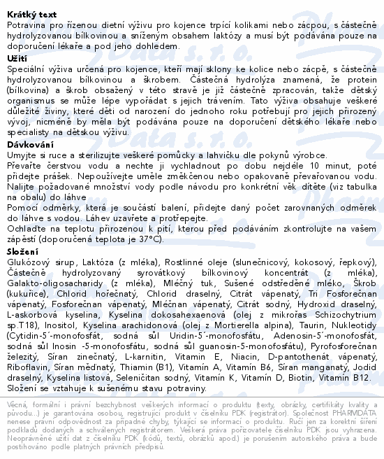 Potravina pro řízenou dietní výživu pro kojence trpící kolikami nebo zácpou, s částečně hydrolyzovanou bílkovinou a sníženým obsahem laktózy a musí být podávána pouze na doporučení lékaře a pod jeho dohledem.