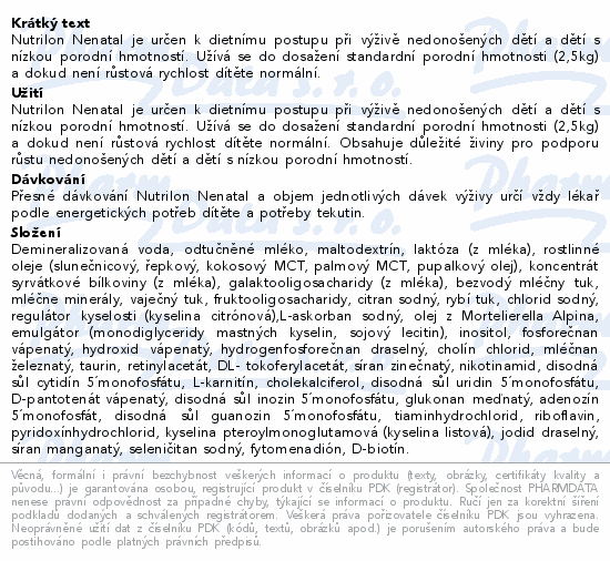 Nutrilon 0 Nenatal je určen k dietnímu postupu při výživě nedonošených dětí a dětí s nízkou porodní hmotností. Užívá se do dosažení standardní porodní hmotnosti (2,5kg) a dokud není růstová rychlost dítěte normální.
