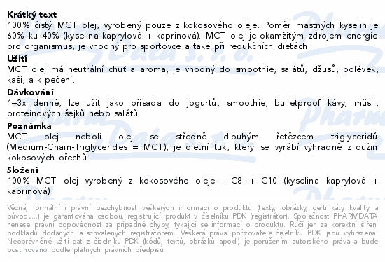 100% čistý MCT olej, vyrobený pouze z kokosového oleje. Poměr mastných kyselin je 60% ku 40% (kyselina kaprylová + kaprinová). MCT olej je okamžitým zdrojem energie pro organismus, je vhodný pro sportovce a také při redukčních dietách.