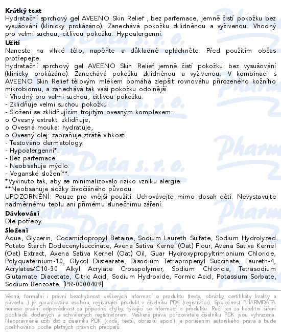 Aveeno Skin Relief Hydratační sprchový gel, bez parfemace. Složení se zklidňujícím trojitým ovesným komplexem. Vhodný pro velmi suchou, citlivou pokožku. Hypoalergenní.
