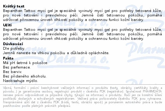 Bepanthen Tattoo mycí gel je speciálně vyvinutý mycí gel pro potřeby tetované kůže, pro nové tetování i pravidelnou péči. Jemně čistí tetovanou pokožku, pomáhá udržovat přirozenou úroveň vlhkosti pokožky a ochrannou funkci kožní bariéry.