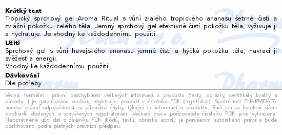 Tropický sprchový gel Aroma Ritual s vůní zralého tropického ananasu šetrně čistí a zvláční pokožku celého těla. Jemný sprchový gel efektivně čistí pokožku těla, vyživuje ji a hydratuje. Je vhodný ke každodennímu použití.