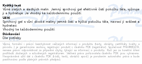 Vůně zralých a sladkých malin. Jemný sprchový gel efektivně čistí pokožku těla, vyživuje ji a hydratuje. Je vhodný ke každodennímu použití.
