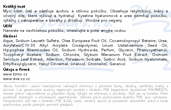 Mycí krém čistí a ošetřuje suchou a citlivou pokožku. Obsahuje rakytníkový, lněný a olivový olej, které vyživují a hydratují. Kyselina hyaluronová a urea zjemňují pokožku, výtažky z ostropestřce a bazalky ji zklidňují. Vhodné pro vegany.