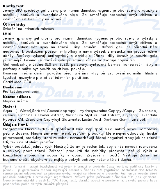 Jemný BIO sprchový gel určený pro intimní dámskou hygienu je obohacený o výtažky z měsíčku, borůvek a levandulového oleje. Gel umožňuje bezpečně omýt citlivou a intimní oblast bez újmy na zdraví.