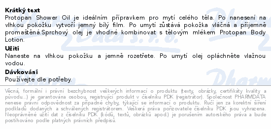Protopan Shower Oil je ideálním přípravkem pro mytí celého těla. Po nanesení na vlhkou pokožku vytvoří jemný bílý film. Po umytí zůstává pokožka vláčná a příjemně promaštěná.Sprchový olej je vhodné kombinovat s tělovým mlékem Protopan Body Lotion.