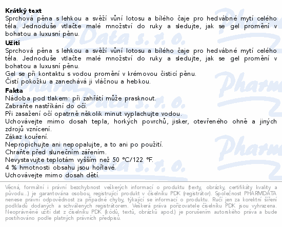 Sprchová pěna s lehkou a svěží vůní lotosu a bílého čaje pro hedvábné mytí celého těla. Jednoduše vtlačte malé množství do ruky a sledujte, jak se gel promění v bohatou a luxusní pěnu.