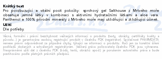 Pro povzbuzující a vitální pocit pokožky: sprchový gel Salthouse z Mrtvého moře obsahuje jemné látky v kombinaci s aktivními hydratačními látkami a aloe vera. Panthenol a 100% přírodní minerály z Mrtvého moře mají uklidňující a zklidňující účinek.