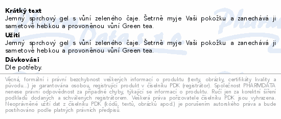 Jemný sprchový gel s vůní zeleného čaje. Šetrně myje Vaši pokožku a zanechává ji sametově hebkou a provoněnou vůní Green tea.