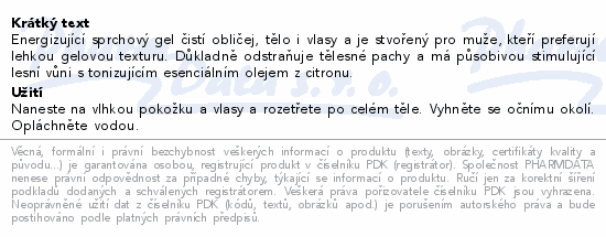 Energizující sprchový gel čistí obličej, tělo i vlasy a je stvořený pro muže, kteří preferují lehkou gelovou texturu. Důkladně odstraňuje tělesné pachy a má působivou stimulující lesní vůni s tonizujícím esenciálním olejem z citronu.