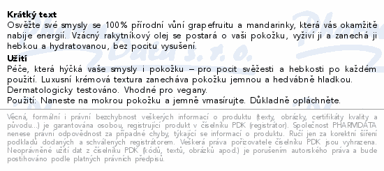 Osvěžte své smysly se 100% přírodní vůní grapefruitu a mandarinky, která vás okamžitě nabije energií. Vzácný rakytníkový olej se postará o vaši pokožku, vyživí ji a zanechá ji hebkou a hydratovanou, bez pocitu vysušení.