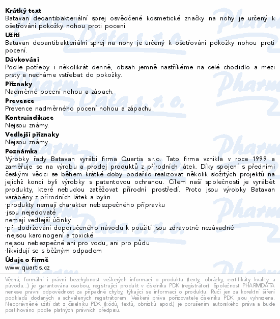 Batavan deoantibakteriální sprej osvědčené kosmetické značky na nohy je určený k ošetřování pokožky nohou proti pocení.