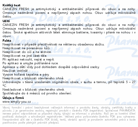 CANEZIN FRESH je antimykotický a antibakteriální přípravek do obuvi a na nohy. Omezuje nadměrné pocení a nepříjemný zápach nohou. Obuv udržuje mikrobiálně čistou.