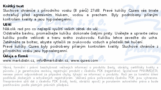 Sluchové chrániče z přírodního vosku (8 párů) 27dB. Pravé kuličky Quies vás trvale ochraňují před agresivním hlukem, vodou a prachem. Byly podrobeny přísným kontrolám kvality a jsou hypoalergenní.