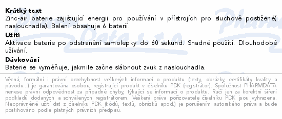 Zinc-air baterie zajišťující energii pro používání v přístrojích pro sluchově postižené( naslouchadla). Balení obsahuje 6 baterií.