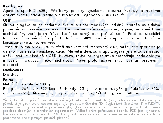 Agáve sirup BIO 600g Wolfberry