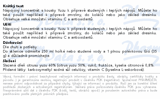 Nápojový koncentrát s kousky Yuzu k přípravě studených i teplých nápojů. Můžete ho také použít například k přípravě zmrzliny, do koláčů nebo jako základ dresinku. Obsahuje velké množství vitamínu C a antioxidantů.