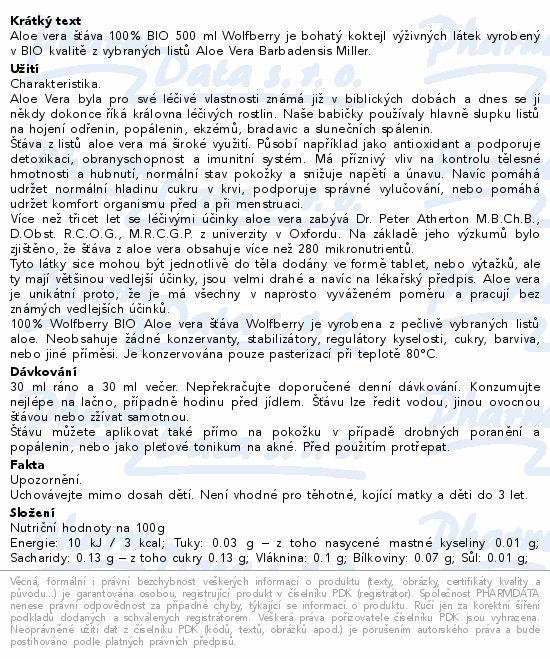 Aloe vera šťáva 100% BIO 500 ml Wolfberry je bohatý koktejl výživných látek vyrobený v BIO kvalitě z vybraných listů Aloe Vera Barbadensis Miller.