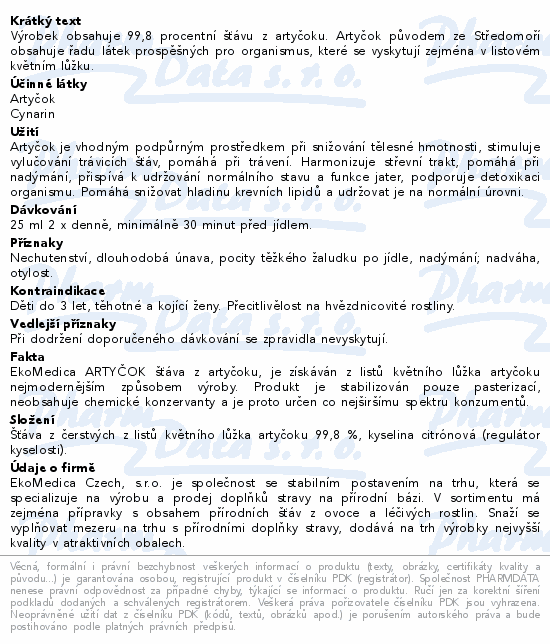 Artyčok šťáva z artyčoku 99% 500ml EKOMEDICA