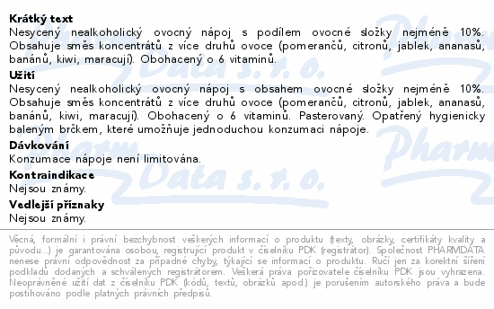 Nesycený nealkoholický ovocný nápoj s podílem ovocné složky nejméně 10%. Obsahuje směs koncentrátů z více druhů ovoce (pomerančů, citronů, jablek, ananasů, banánů, kiwi, maracují). Obohacený o 6 vitaminů.