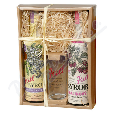 Dárkové balení Kitl Syrobů se skleničkou. Poctivé sirupy pro přípravu tradičních domácích limonád. Kitl Syrob Bezový je vyroben z bezových květů v BIO kvalitě a Kitl Syrob Malinový s dužninou obsahuje 100% ovocného podílu a dužniny.