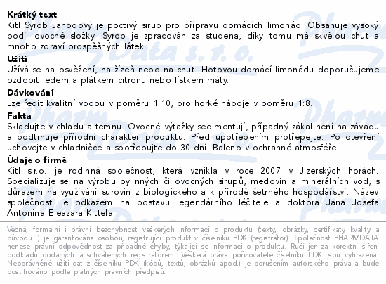 Kitl Syrob Jahodový je poctivý sirup pro přípravu domácích limonád. Obsahuje vysoký podíl ovocné složky. Syrob je zpracován za studena, díky tomu má skvělou chuť a mnoho zdraví prospěšných látek.
